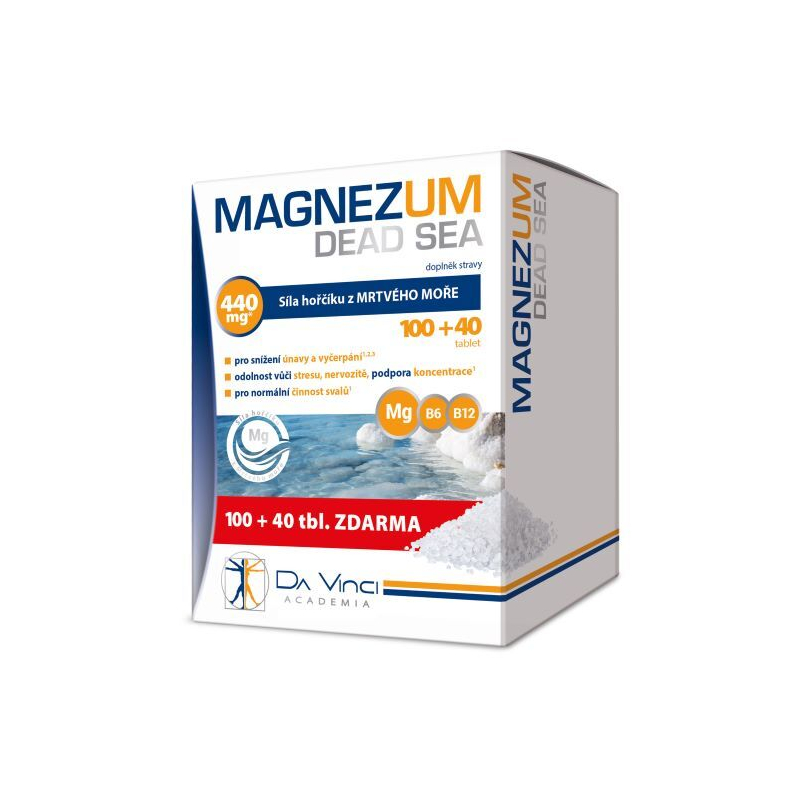 Magnezum Dead Sea je vysoce kvalitní doplněk stravy, který obsahuje přírodní hořčík z Mrtvého moře a vitamíny B6 a B12. Tento jedinečný produkt přispívá k normálnímu energetickému metabolismu, činnosti nervové soustavy a psychické pohodě. Hořčík pomáhá snižovat únavu a vyčerpání, podporuje elektrolytickou rovnováhu a normální činnost svalů. Vitamín B6 zajišťuje správnou tvorbu červených krvinek a funkci imunitního systému, zatímco vitamín B12 se podílí na dělení buněk a rovněž přispívá k psychické činnosti. Doporučená dávka je 1 tableta denně, v případě zvýšené zátěže 2 tablety. Balení obsahuje 140 tablet, což vystačí na 70 dní.