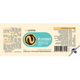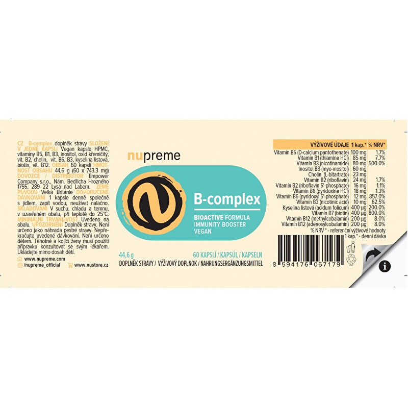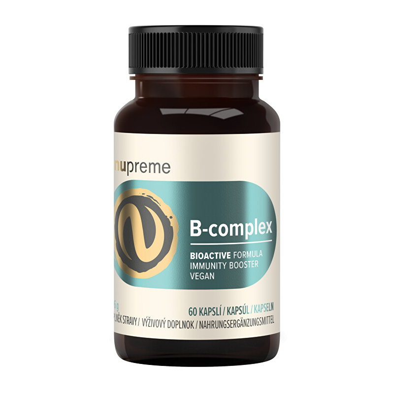 Doplněk stravy Nupreme B-complex Bioactive nabízí komplex všech klíčových vitaminů skupiny B ve formě biologicky aktivních látek. Tyto vitaminy, rozpustné ve vodě, přispívají k energetickému metabolismu a podporují normální funkci nervové soustavy a psychické zdraví. Produkt je ideální pro ty, kteří čelí únavě, stresu nebo potřebují zlepšit celkovou pohodu. Obsahuje důležité složky jako vitamín B12, kyselinu listovou a biotin, které přispívají k normální činnosti imunitního systému a zdraví pokožky. Užívejte jednu kapsli denně s jídlem pro maximální účinek. Balení obsahuje 60 kapslí, což vystačí na dva měsíce.