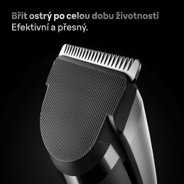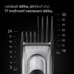 Zastřihovač vlasů, malý hřeben (3–24 mm), velký hřeben (14-35 mm), nabíjecí stojánek, čisticí kartáček, pouzdro se šňůrkou, napájecí adaptér.